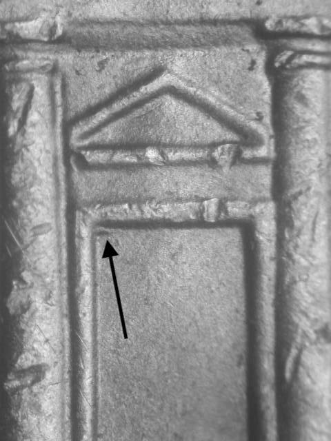- Rev: Die dot above small right window; die dot inside large semicircular window above center door.