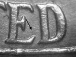 - Rev: Die gouge to upper left of P of PLURIBUS; die gouge to lower left of R of PLURIBUS.