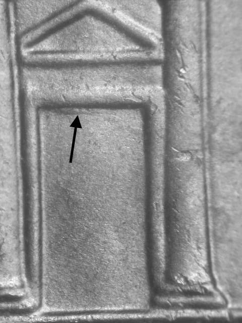 - Rev: Die scratches to right of the dome; die scratches inside large semicircular window.