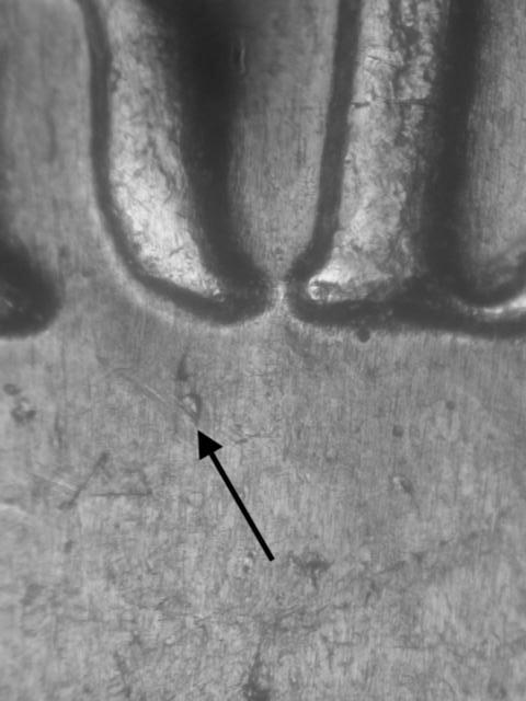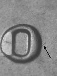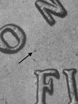- Rev: Die gouge inside left arch; die gouge above right arch.