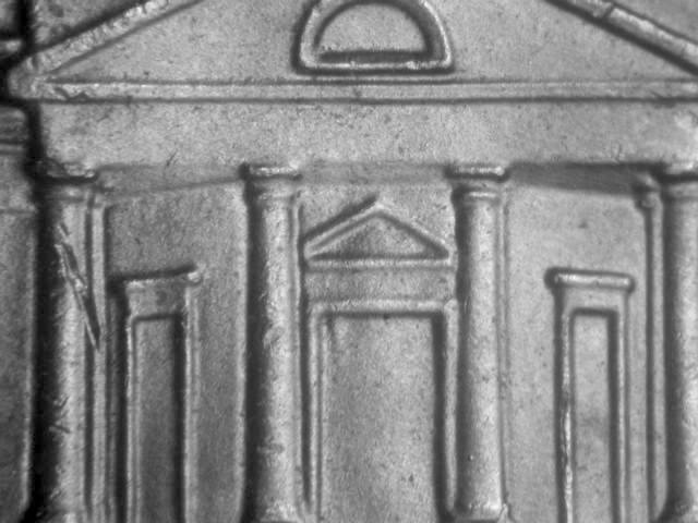 Class VIII doubling shows along the right side of the door frame on the center door above the steps.  Extra thickness shows on the top left side of the triangle above the center door.