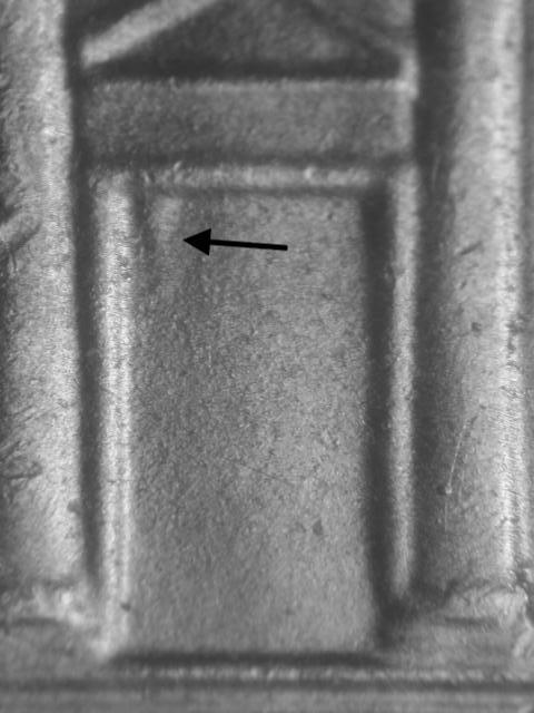 • Rev:  Die gouge above NT of CENTS; die dot above left arch near roof line; small die dot to upper left of center dome arch.