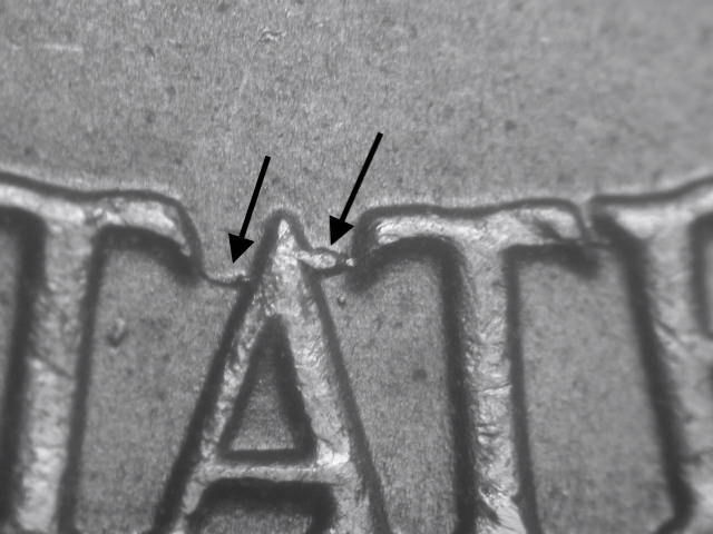 • Rev:  Two short die scratches above first S of STATES; small die dot in long window just to right of center door.