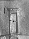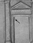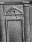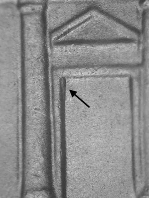 - Rev: Small die gouge above right side of triangular window above center door above the steps.
