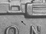 - Rev: Die chip inside lower right portion of left arch; small die gouge at upper right corner of small right window.