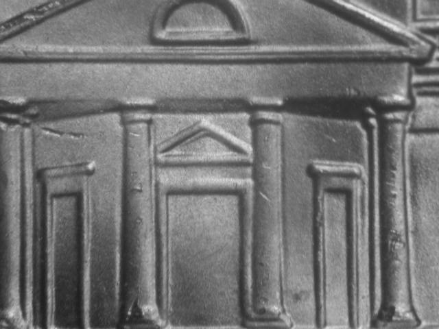 - Rev: Die gouge (dot) below and between long and small windows on right side of building; die dot to left of large center semicircular window.