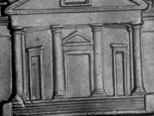 - Rev: Die gouge in field above upper right portion of roof; small die dot to left of large semicircular window.