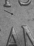 - Rev: Die gouge between first U and R of PLURIBUS.