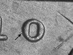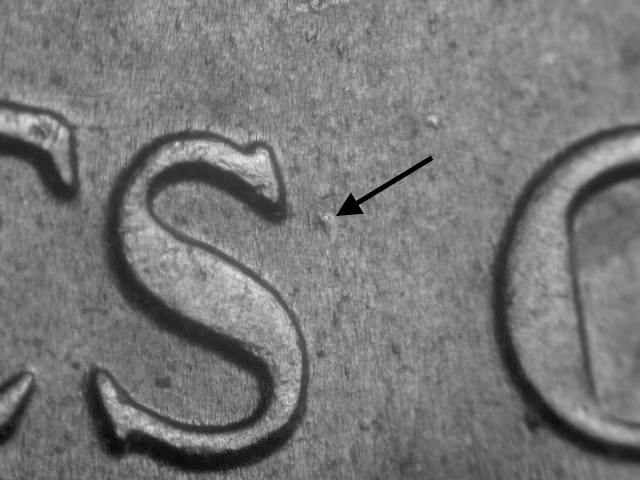- Rev: Die dot between lower portions of P and L of PLURIBUS; die gouge across upper portions of O and F of OF; two die dots above E of CENTS.