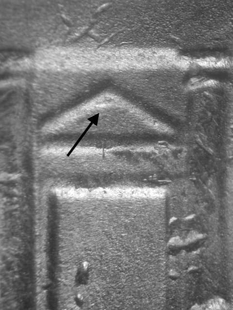 - Rev: Series of slanted die gouges through triangle and upper portion of center door above steps; series of slanted die gouges in field to left of dome.