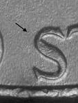 - Rev: Die gouge (dot) below B of PLURIBUS; die gouge above D of UNITED.
