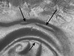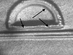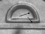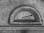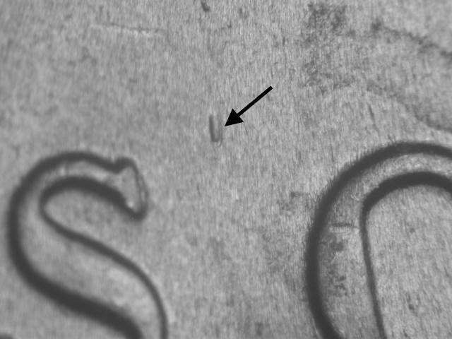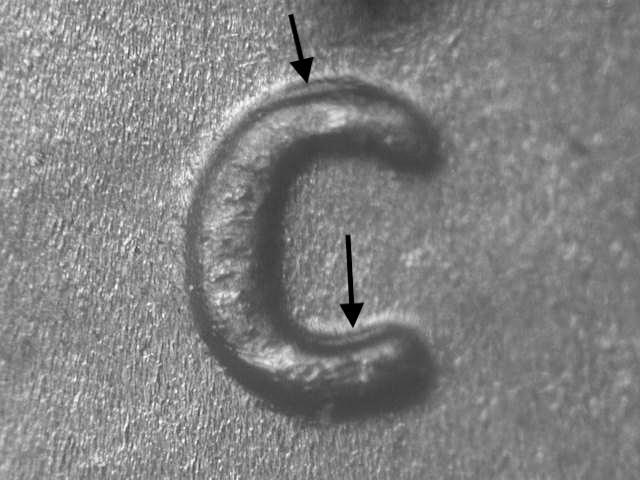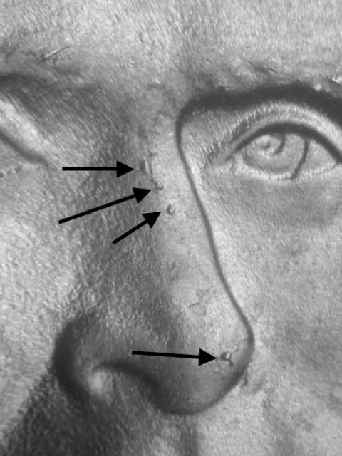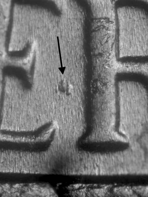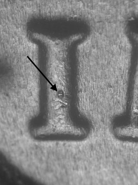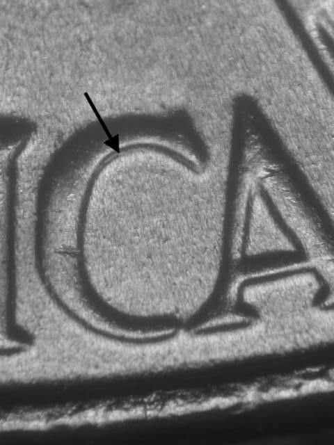 - Rev: Die gouge above IC of AMERICA; die gouge above right arch; die dots above and to the left of the large semicircular window.