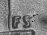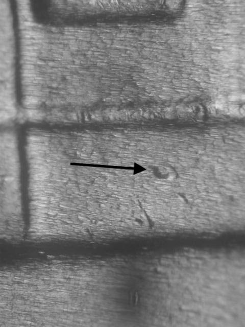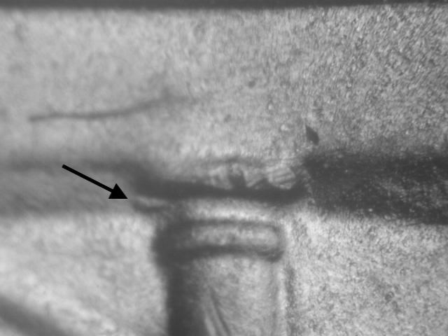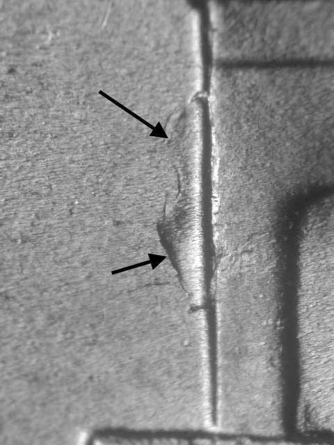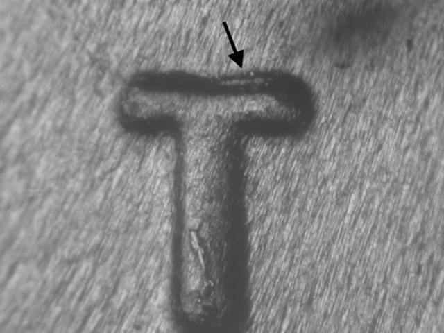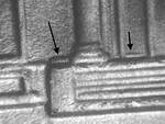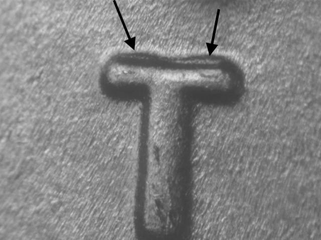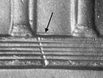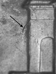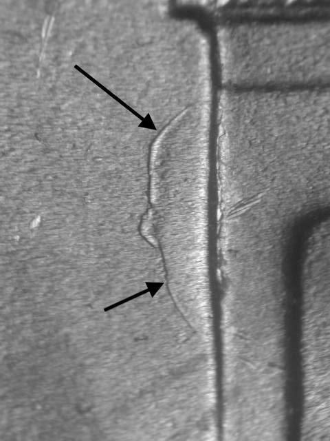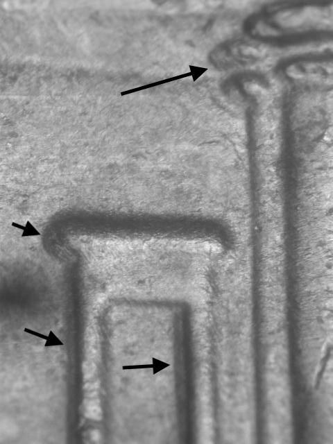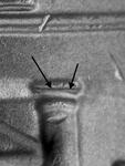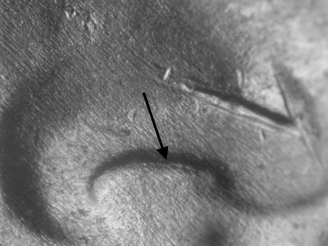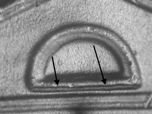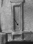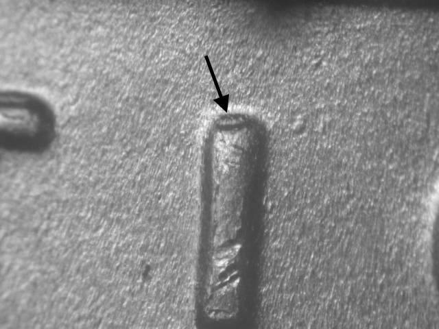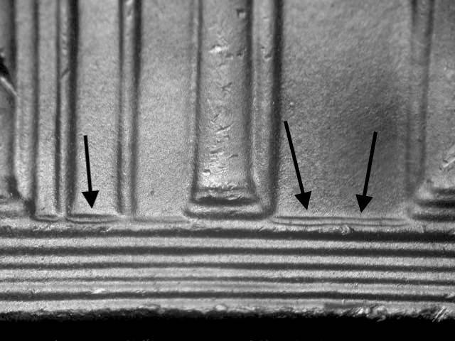 - Rev: Die gouge inside long left window; die gouge above long right window.