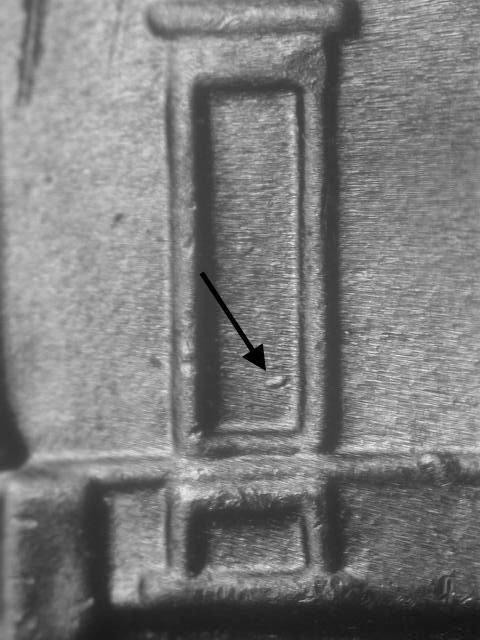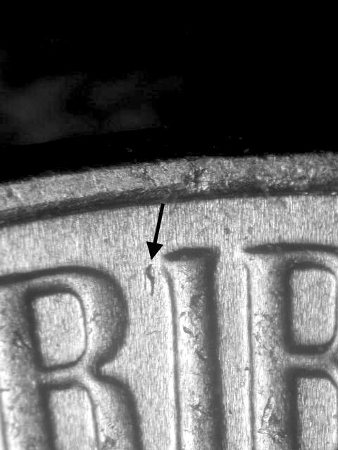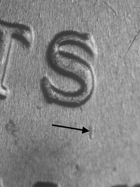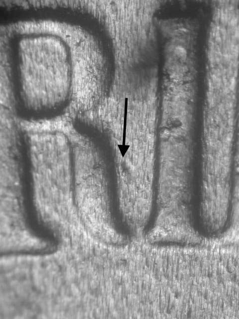 - Rev: Die gouge inside lower portion of the long right window; die gouge between upper portions of RI of PLURIBUS.