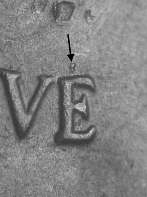 - Obv: Die gouge to upper right of 0 of date; series of die gouges to left of first 2 of date.