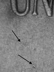 - Rev: Die pitting between lower portion of F of OF and first A of AMERICA; die gouge inside first U of PLURIBUS; die gouge below small right window.