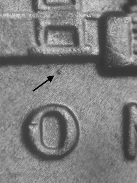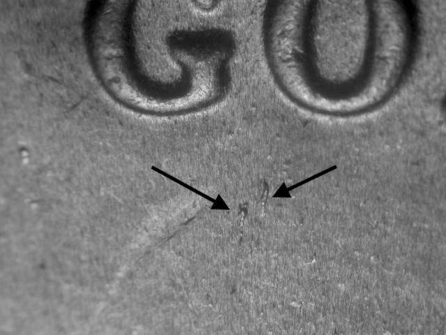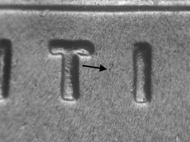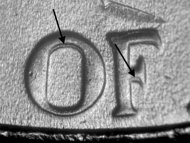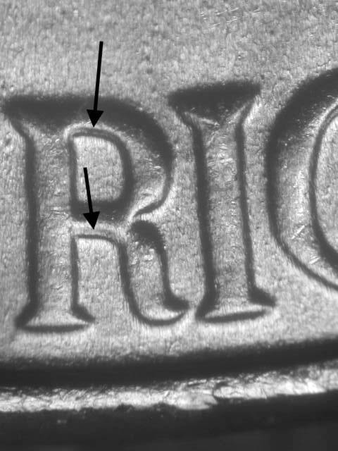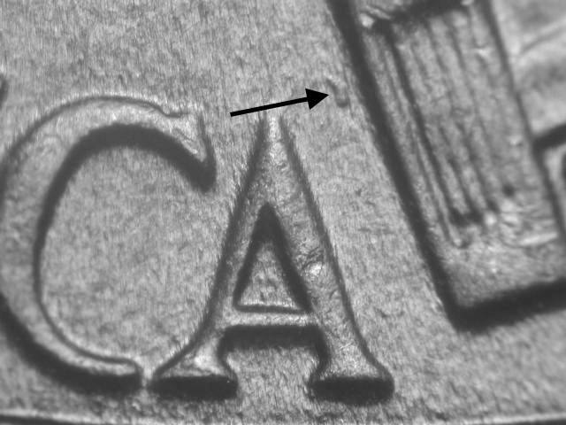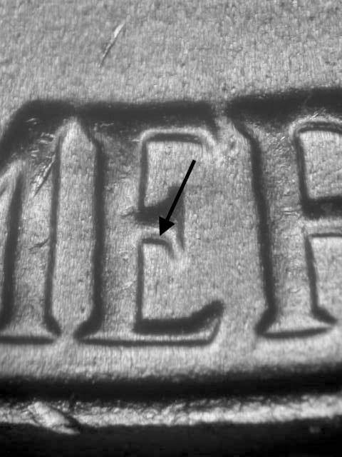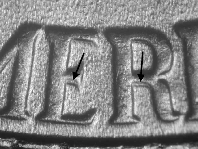 - Rev: Die gouge between ER of AMERICA; die dot below small right window; die gouge above T of CENTS.