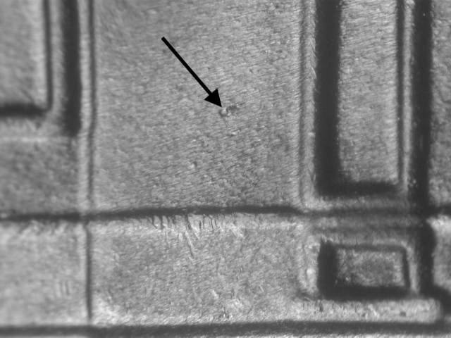 - Rev: Die gouge between the two right windows; die chip on left side of dome