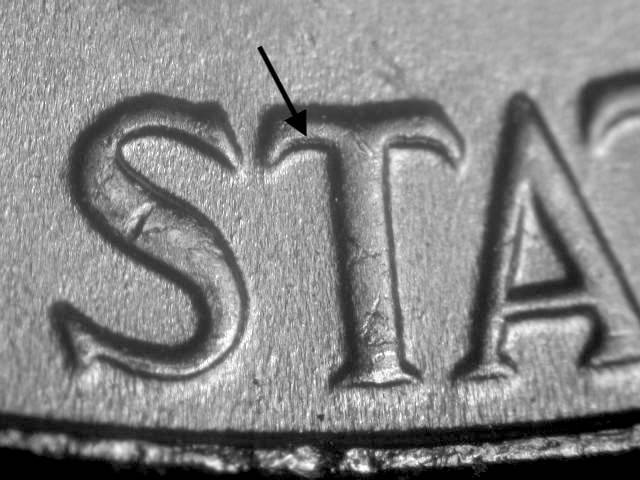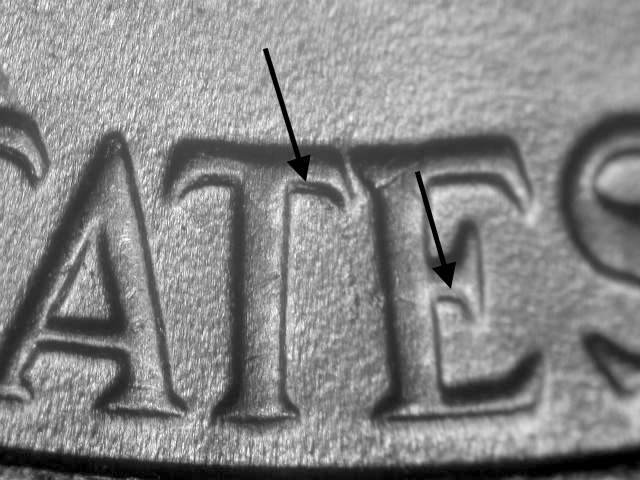 - Rev: Die scratch through AT of STATES; die gouge above long right window; die gouge above long left window.